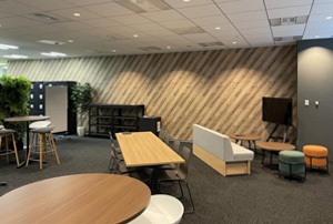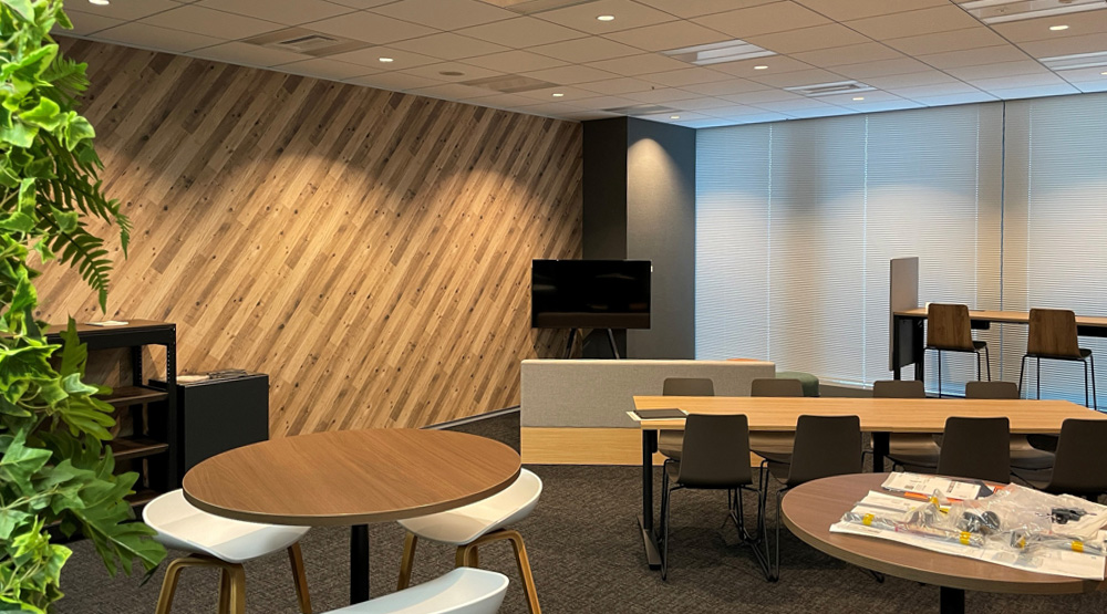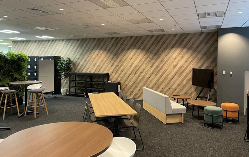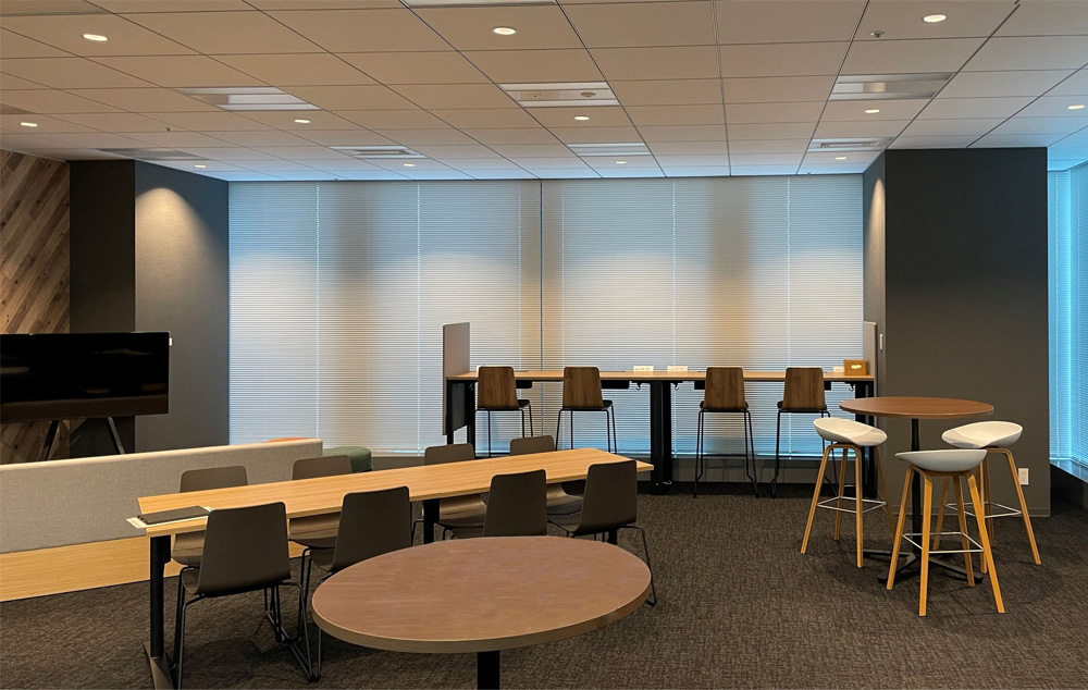 空きスペースを社員同士の交流の場として活用したいという要望を受け、日常のオフィスとは異なるラウンジのような空間を提案いたしました。計画地はパーソナルロッカーが並ぶエリアに隣接していましたが、ビル既存の照明を電球色のダウンライトへと変更し、一部の遊休什器を活用しつつも、統一感のある内装・什器を選定することで、周囲の空間との差別化を図りました。